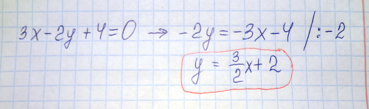преобразовав линейное уравнение 3х-2у+4=0 к виду y=kx+m найдите угловой коэффициент полученной линейной функции