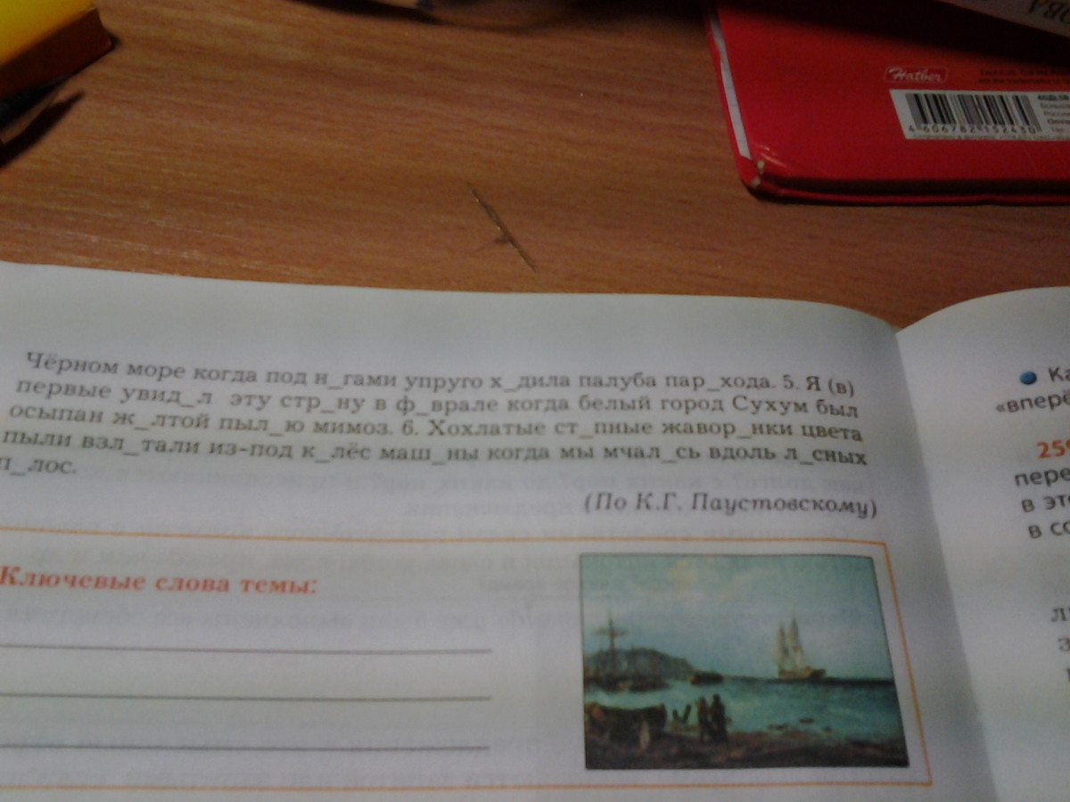 1.Музыка оборвалась,когда в окнах заполыхал багровый закатный свет.2.Я уехал вечером, когда гудели под ветром сосновые леса.3.Я увидел зеленеющие поля, взрытую землю, новые арыки, когда поезд шёл обратно.4.Закат встретил нас в Чёрном море, когда под ногами упруго ходила палуба парохода.5.Я впервые увидел эту страну в феврале, когда белый город Сухум был осыпан жёлтой пылью мимоз.6.Хохлатые степные жаворонки, цвета пыли ,взлетали из-под колёс машины, когда мы мчались вдоль лесных полос.