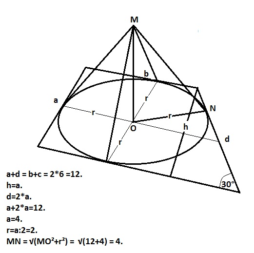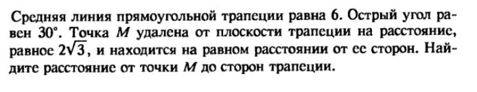 Раз точка М находится на равном расстоянии от СТОРОН трапеции, то это значит, что ее проекция является центром вписанной в эту трапецию окружности. А мы знаем, что в этом случае сумма боковых сторон трапеции равно сумме оснований (свойство трапеции). Сумма оснований нам дана, она равна 12. Заметим, что одна из боковых сторон трапеции (перпендикулярная основаниям) является диаметром вписанной окружности. Нам также дан острый угол = 30°. Опустим высоту из тупого угла на большее основание. В полученном прямоугольном треугольнике гипотенуза (наклонная боковая сторона) равна удвоенной второй стороне (высоте трапеции), так как высота лежит против угла 30°. Имеем уравнение: a+2*a=12, откуда а=4 (а - сторона, равная высоте и равная диаметру вписанной окружности). Точка М находится на расстоянии 2√3 от плоскости трапеции. Имеем прямоугольный треугольник с гипотенузой - искомым расстоянием и катетами 2√3 и 2 (радиус окружности). Отсюда по Пифагору искомое расстояние равно √(12+2) = 4.