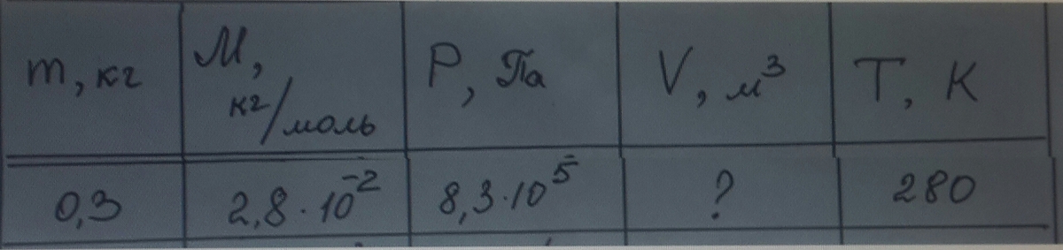 V=mRT/PM=0,3*8,31*280/8,3*10^5*2.8*10^-2=3*10^-2