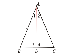 Из равенства треугольников АВD и АСD (по 2 признаку равенства треугольников:AD-общая;углы 1 и 2 равны т.к. AD-биссектриса;AB=AC,т.к. треугольник равнобедренный) следует, что ВD = DC и 3 = 4. Равенство ВD = DC означает, что точка D — середина стороны ВС и поэтому АD — медиана треугольника АВС. Так как углы 3 и 4 смежные и равны друг другу, то они прямые. Следовательно, отрезок АО является также высотой треугольника АВС. Теорема доказана.