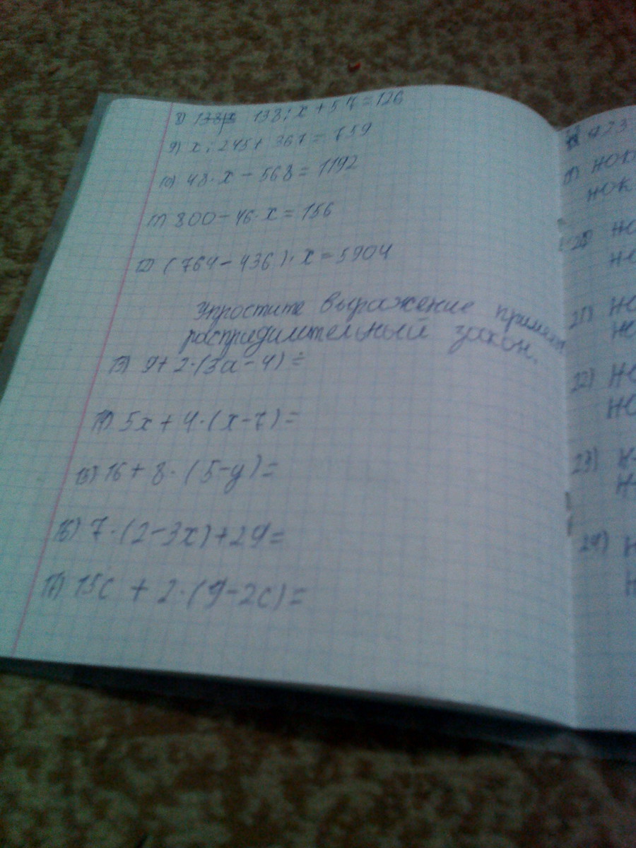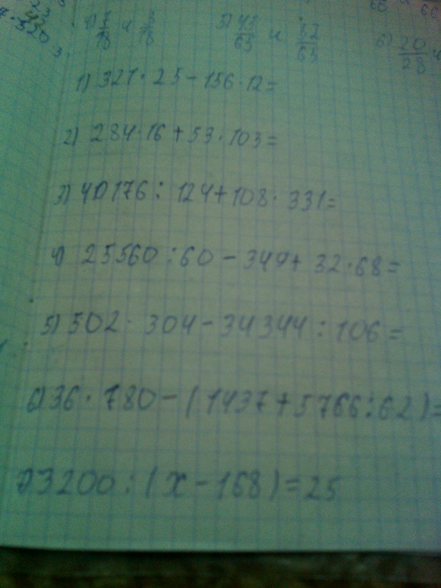 Второй:284*16=4544 53*103=5459 4544+5459=10003 Третий:4076/124=324 108*331=35748 324+35748=36072 Четвёртый:25560/60=426 32*68=2176 426-349=77 Пятый:502*304=152608 34344/106=324 152608-324=152284 Шестой:5766/62=93 1437+93=1530 36*780=28080 28080-1530=26550