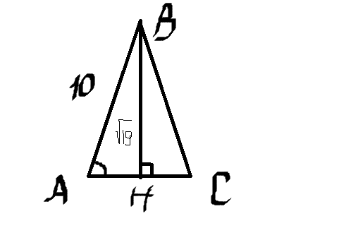 Косинус - это отношение прилежащего катета АН (Н - основание высоты ВН) к гипотенузе АВ. АВ=10, АН - ? Найдем АН из треугольника АВН - прямоугольного. АН=√10²-(√19)²=√100-19=√81=9. cos A=9/10=0,9 - ответ.