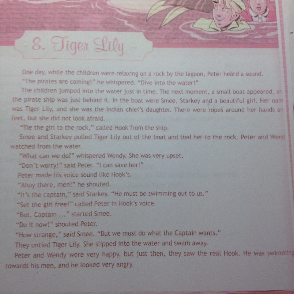 Дети сразу же прыгнули в воду. В следующую секунду появилась маленькая лодка, а за ней пиратский корабль. На лодке были Сми, Старки и красивая девочка. Её звали Тайгер Лили и она была дочерью индейского вождя. Её руки и ноги были связаны веревками, но она не выглядела испуганной.