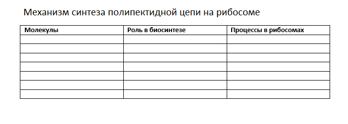 ТАБЛИЦА "МЕХАНИЗМ СИНТЕЗА ПОЛИПЕПТИДНОЙ ЦЕПИ НА РИБОСОМЕ"