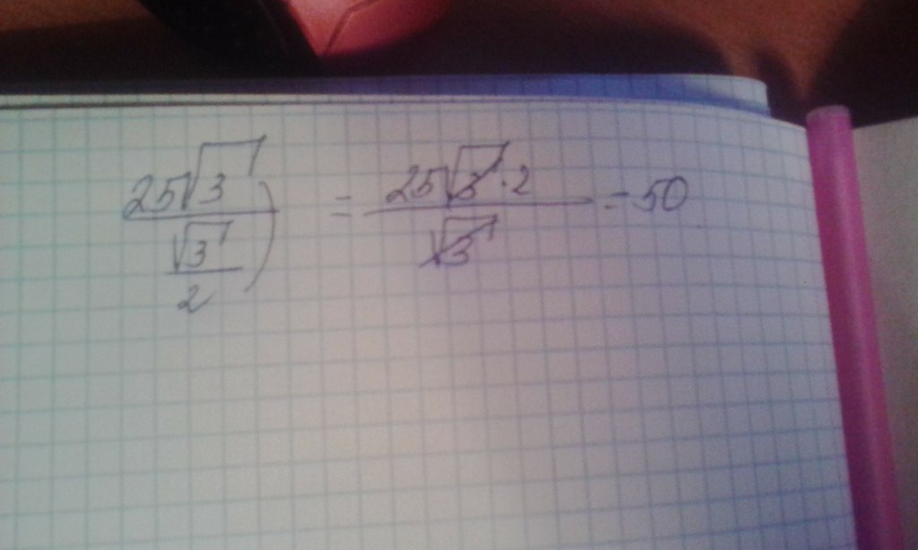 чтобы разделить дробь (25корней из 3)/1 на дробь (корень из 3)/2, надо делимое умножить на перевернутую( обратную) дробь. Тогда корень из 3 в числителе сократится с корнем из 3 в знаменателе и остается в числителе 25 умножить на 2 , а в знаменателе 1. Ответ 50.