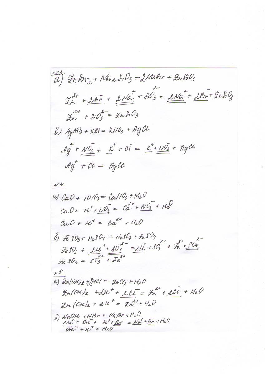 3a)ZnBr2+Na2SiO3=NaBr+ZnSiO3 b)AgNo3+KCl=kNO3+AgCl 4a)CaO+HNO3=CaNO3+H2O b)FeSO3+H2SO4=H2SO3+FeSo4 5A)Zn(oh)2+HCl=ZnCl2+H2O b)NaOH+HBr=NABR+H2O полные и короткие ионные уравнения