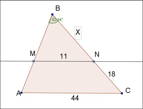 Прямая,параллельная стороне АС треугольника АВС,пересекает стороны АВ и ВС в точках М и N соответственно.Найдите ВN,если MN =11, AC =44, NC =18 . Пожааалуйста)