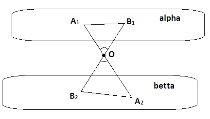 У образовавшихся треугольников ОА1В1 и ОА2В2 соответствующие углы равны. Углы при вершине О равны как вертикальные, а остальные — как внутренние накрест лежащие у параллельных прямых. Следовательно треугольники ОА1В1 и ОА2В2 подобны.