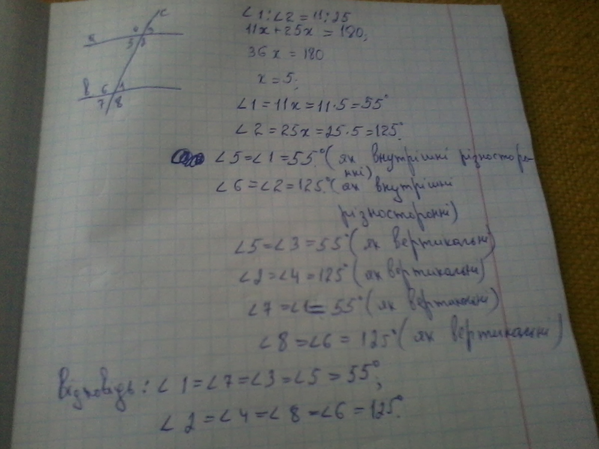 двух параллельных прямых секущей, если внутренние односторонние углы относятся как 11:25.