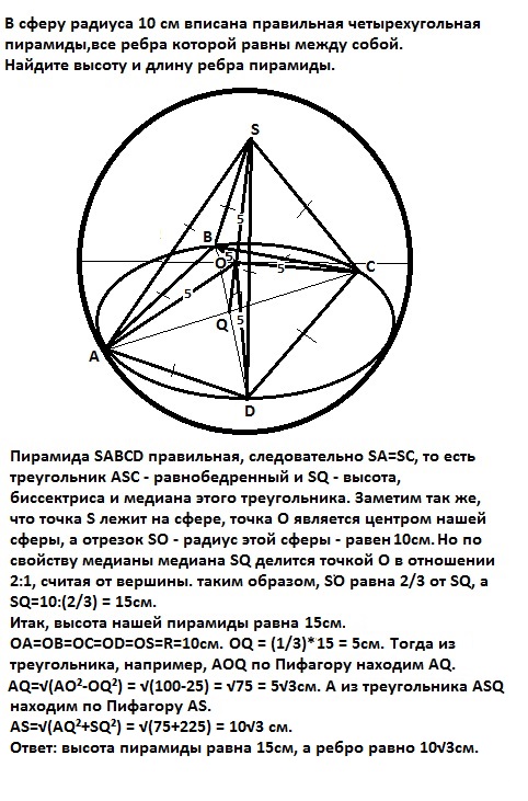 В сферу радиуса 10 см вписана правильная четырехугольная пирамиды,все ребра которой равны между собой.Найдите высоту и длину ребра пирамиды. Помогите пожалуйста))