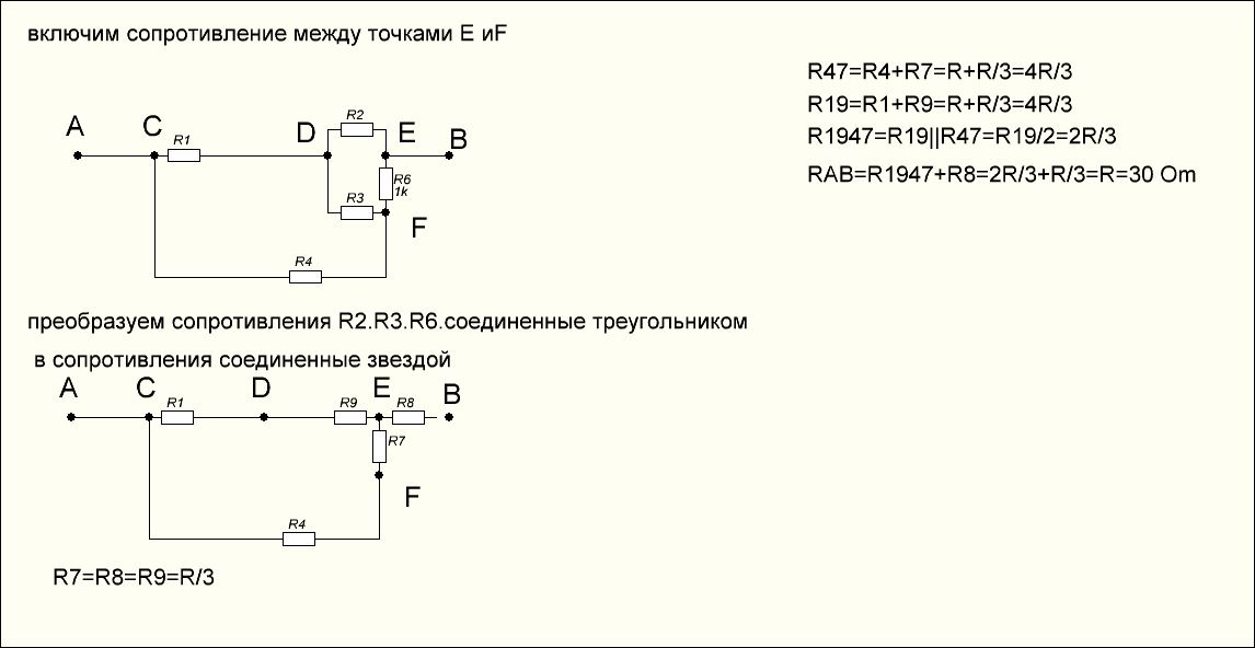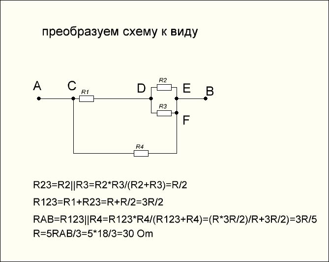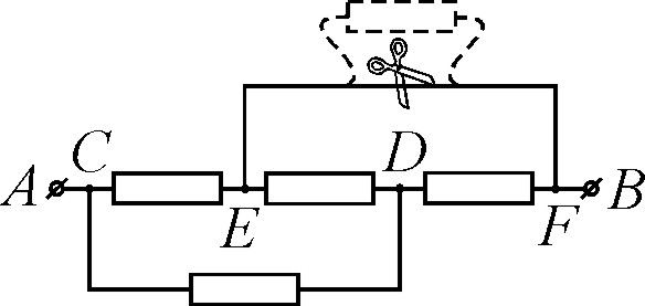 Четыре одинаковых резистора соединены в цепь, схема которой изображена на рисунке сплошными линиями, причем сопротивление между клеммами A и B равно R= 18 Ом. Чему станет равным сопротивление R´ между клеммами A и B, если проводник, соединяющий точки E и F, разрезать и подключить в образовавшийся разрыв цепи еще один такой же резистор, как показано на рисунке штриховыми линиями? Ответ приведите с точностью до целых.