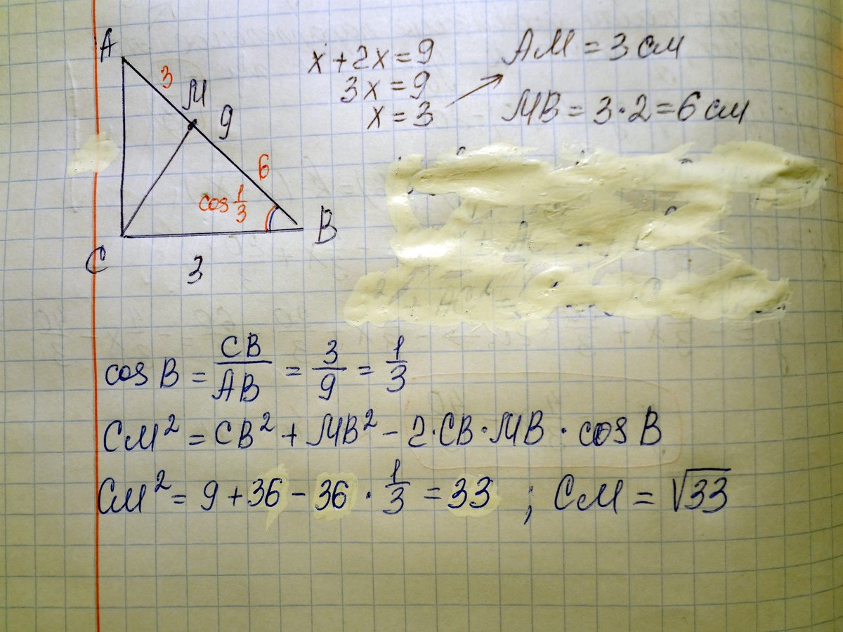 Гипотенуза ав прямоугольного треугольника авс равна 9, катет вс=3. На гипотенузе взята точка М, причем ам:мв=1:2. Найти см. Только т.косинусов и синусов