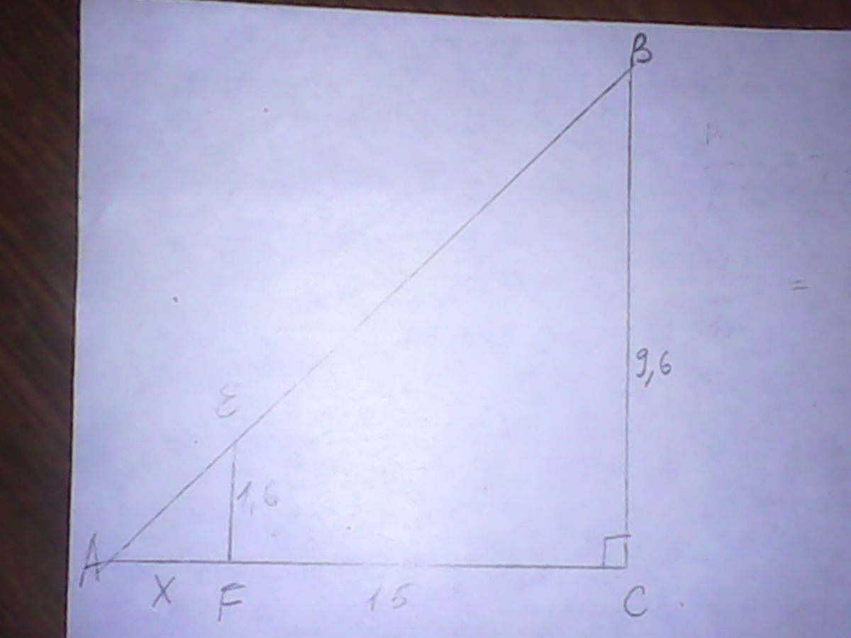 Человек ростом 1,6 м стоит на расстоянии 15 м от столба, на котором висит фонарь на высоте 9,6 м. Как найти длину тени человека в метрах? Помогите пожалуйста