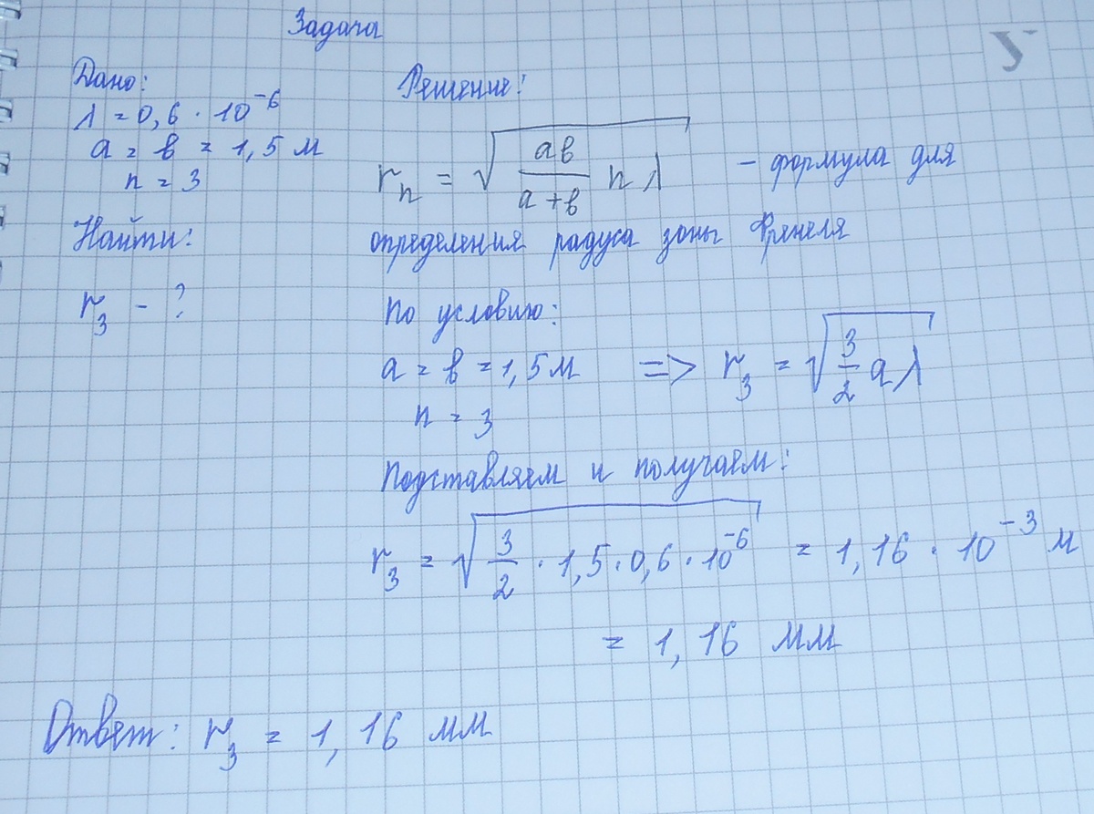 Определить радиус третьей зоны Френеля, если расстояния от точечного источника света (λ = 0,6 мкм) до волновой поверхно-сти и от волновой поверхности до