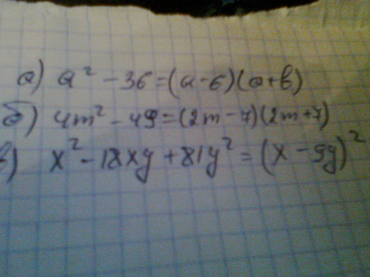 а) a^2 - 36 б) 4m^2 - 49 в) x^2 - 18xy +81y^2