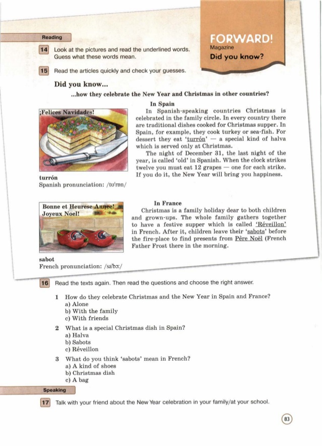 Ночь 31 декабря называют "старой" в Испании. Когда часы бьют 12, вы должны съесть 12 виноградин, по одной с каждым ударом.