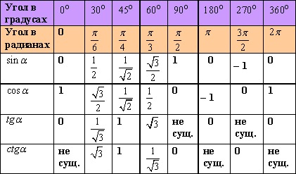 Найти числовые значения тригонометрических функций для значений аргумента 0, π/2, π, 3π/2, 2π, π/6, π/4 и π/3.