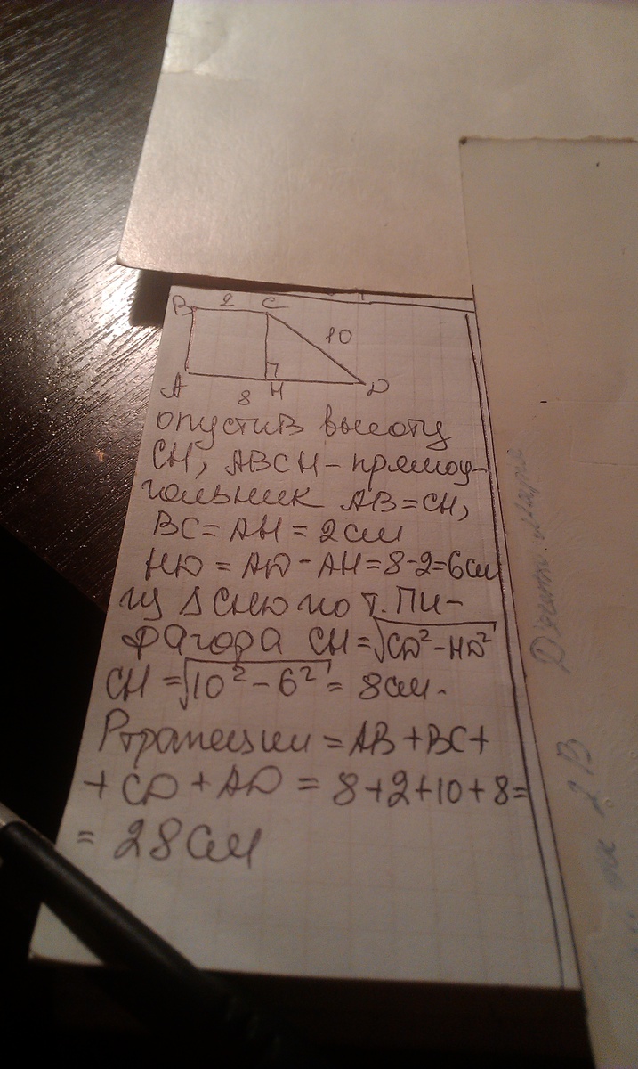 Найдите периметр трапеции прямоугольной, основания которой равна 2 сантиметра и 8 см, а большая боковая сторона 10 см