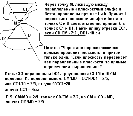 Через точку M, лежащую между параллельными плоскостями альфа и бетта, проведены прямые l и k. Прямая l пересекает плоскости альфа и бетта в точках C и D соответственно прямая k- в точках C1 и D1. Найти длину отрезка CC1, если CD:CM - 7:2 , DD1- 10 см