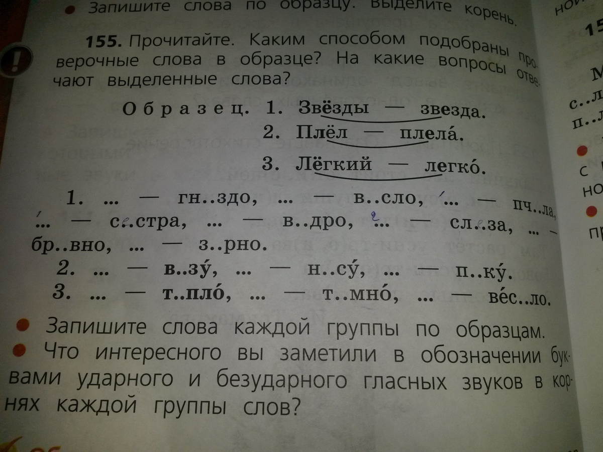 Прочитайте. Каким способом подобраны проверочные слова в образце? На какие вопросы отвечают выделенные слова? Запишите слова каждой группы по образцам.