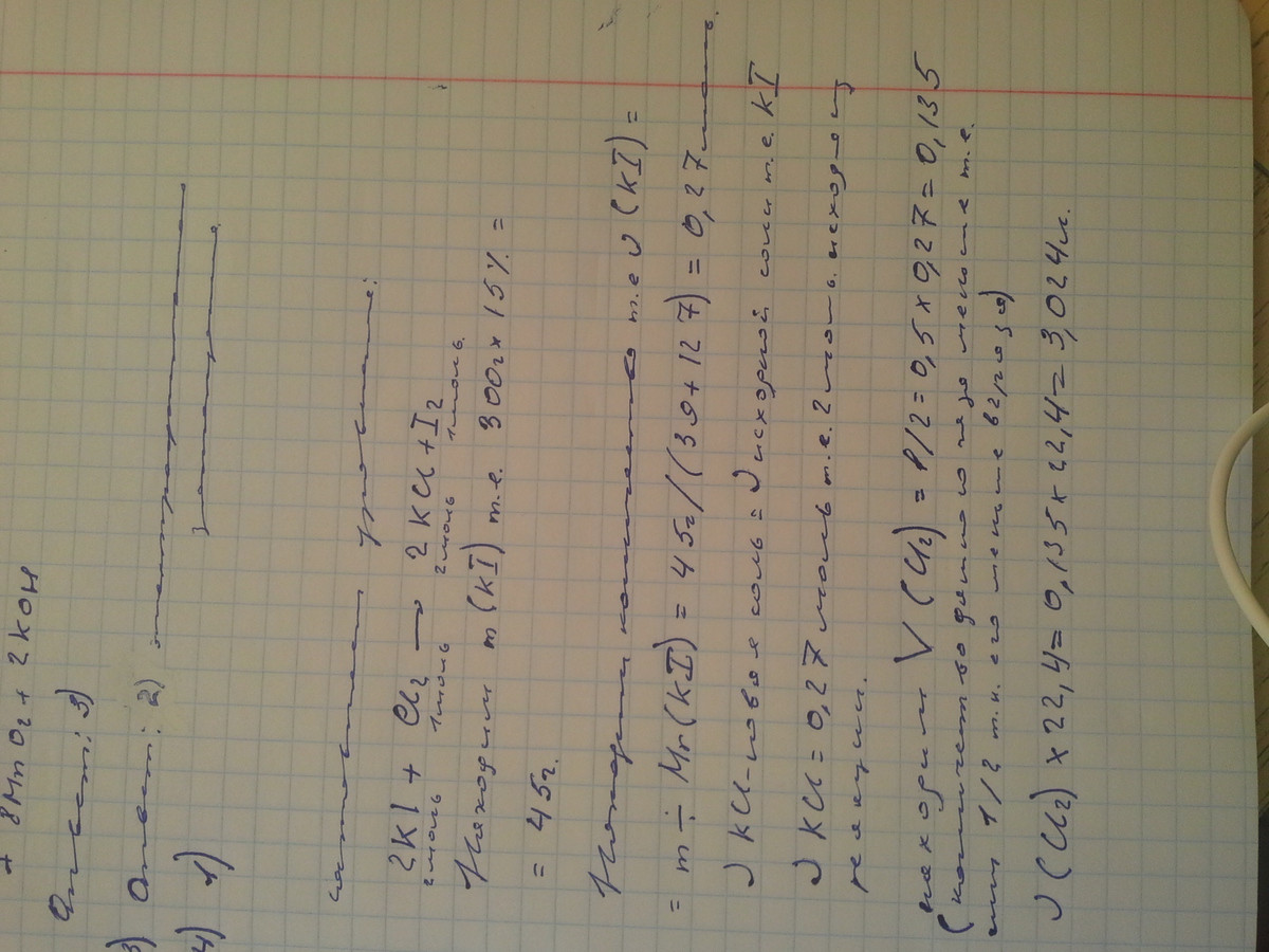 Вычислите объем хлора (н.у.), который потребуется для вытеснения всего йода из 300г. 15% раствора йодида калия. Вычислите количество вещества новой соли, которое при этом образуется. (ТОлько решите как положено с дано, решение, уравнение реакции и комментарии, что от куда взялось)
