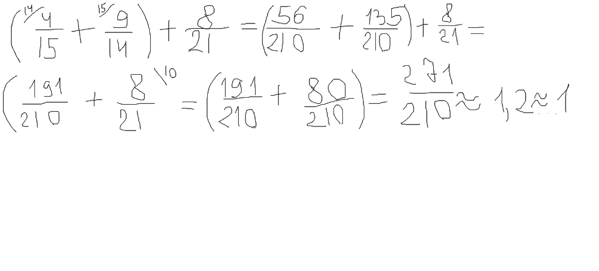 сложите дроби выделите целую часть плиз срочно а)4/15+9/14+8/21= б)1целая 7/15+ 2цел 11/36+6/35= в)2ц 13/20+3ц 7/8= г)3/4+2/7+3/10+1/4+7/10+3/7= д)5/18+3/20+1/18+17/20 заранее спасибо плиз с решением