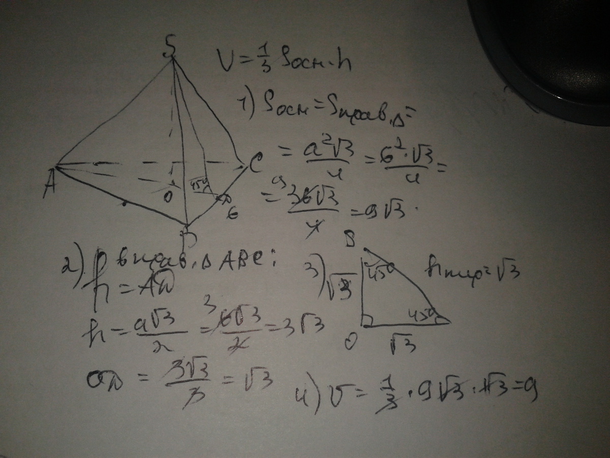 Сторона основания правильной треугольной пирамиды равна 6, а двугранный угол при основании равен 45º. Найдите объем пирамиды.