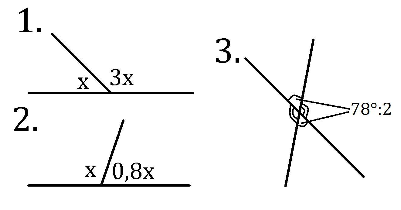 3)если две прямые пересеклись, то получится в итоге 4 угла, сумма их всех=360, и они равны попарно. тогда большой угол = (360-78) /2 = 141