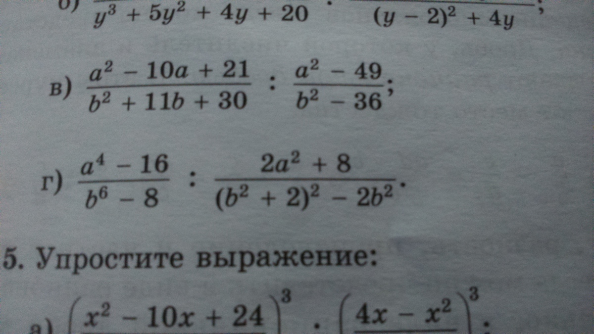 a^2 - 10a + 21 преобразуем а^2-7a -3a + 21=( a^2-7a) + ( -3a+21) выносим из скобки и меняем знак = а(а-7) - 3(а-7) = (а-7)(а-3) это числитель первой дроби так же преобразуем знаменатель в^2 +6b+5b + 30= (d^2 +6b)+(5b+30)= b(b+6)+5(b+6)=( b+6)(b+5) a^2-49 =(a-7)(a+7) b^2-36= (b-6)(b+6) преобразованные выражения подставляем и получаем (а-7)(а-3) x (b-6)(b+6) /(b+6)(b+5) x (a-7)(a+7) делаем сокращение и получаем (а-3)(b-6) /(b+5) x (a+7) второй пример также начинается с преобразования (a^4-16)= (a^2 -4)(a^2+4) 2a^2+8 = 2(a^2+4) следующее b^6-8 =(b^2)^3 - 2^3= (b^2-2)(b^4 + 2b^2 +4) формула преобразования разности квадрата затем (b^2+2)^2 - 2b^2 = b^4 +4b^2 + 4 - 2b^2 = b^4 + 2b^2 +4 подставляем все в пример (а^2 +4)(a^2-4) x (b^4=2b^2+4) / (b^2-2)(b^4=2b^2+4) x 2(a^2+4) сокращаем и получаем (a^2-4) / 2 (b^2-2)
