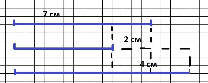 Ваня начертил три отрезка.Первый длиной 7см.,второй на 2см.короче первого,а третий на 4см. длиннее второго.На сколько см. третий отрезок длиннее первого?выполнить чертеж.