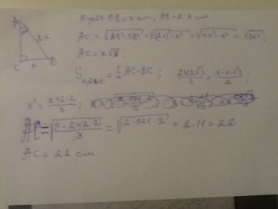 площадь прямоугольного треугольника 242 корень из 3/ 3. один из острых углов 30°. Найдите длину катета, прилежащего к этому углу.