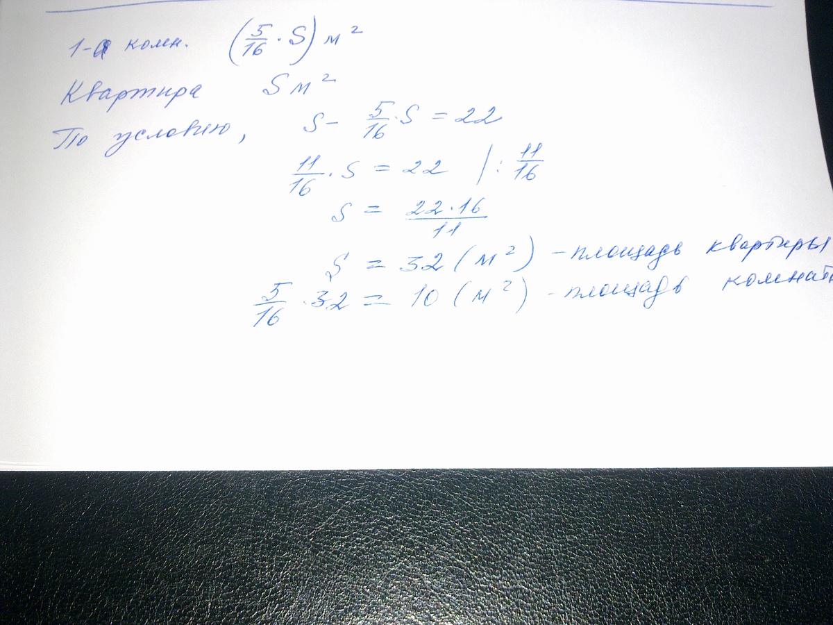 Площадь одной комнаты составляет 5/16 всей площади квартиры. Чему равна площадь этой комнаты , если она на 22 кв. м. меньше , чем площадь всей квартиры?