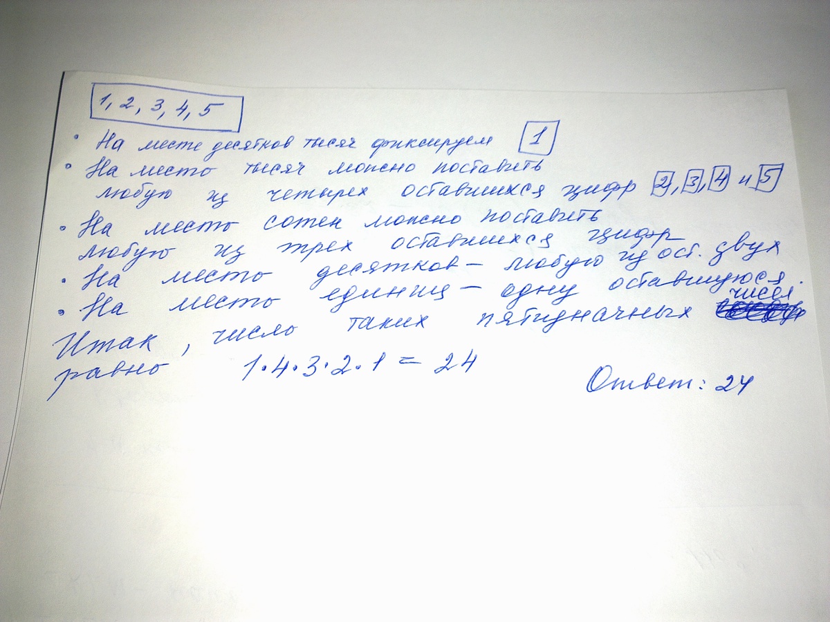 Из цифр 1, 2, 3, 4, 5 составляются всевозможные пятизначные числа, начинающиеся с 1, в записи которых содержатся все данные цифры (цифры в записи числа не повторяются). Тогда количество таких чисел равно