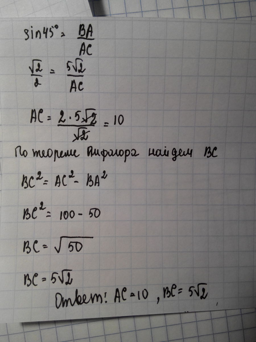 тк С=45, значит угол А= 180-(90+45)=45, следовательно треуг равнобедренный