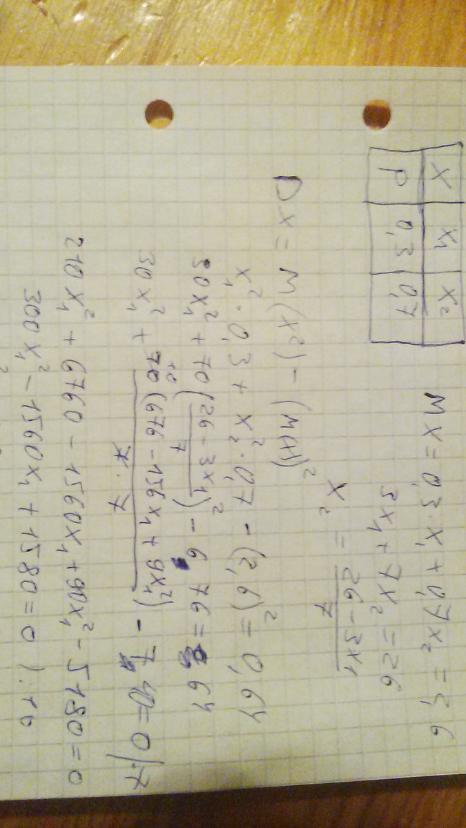 Помогите, пожалуйста.Не могу понять где ошиблась. ДСВ Х принимает два значения х1 и х2, причем х1<х2. Вероятность того, что СВ Х примет значение х1, равна 0.3. Найти закон