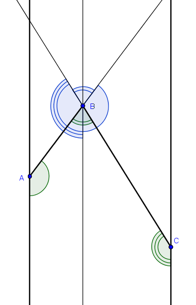 Проведем через точку B прямую, параллельную двум другим параллельным прямым. Углы с одной дужкой равны, так как они - соответственные, с двумя дужками - вертикальные, с тремя дужками - тоже соответственные. Поэтому искомая сумма углов равна полному углу, т.е. 360 градусов.