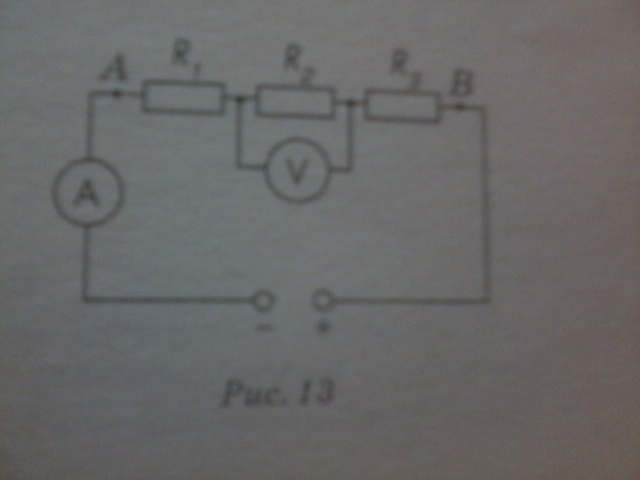 На рис.13 зображено електричне коло,в яке послідовно увімкнені три провідники з опорами R1=3 Ом,R2=5 Ом,R3=10 Ом.Розрахуйте силу струму в колі та напругу між точками А і В,якщо вольтметр,увімкнений до провідника з опором R2,що показуе 2В