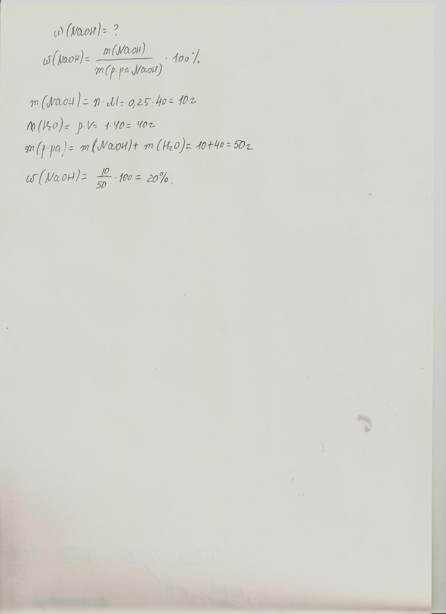Рассчитайте массовую долю (%) щелочи в растворе, для приготовления которого использовали натрий гидроксид количеством 0,25 моль и воду объемом 40 мл.