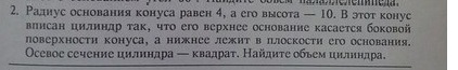 Впишем в конусю цилиндр так, чтобы осевым сечением был квадрат АВСD. Вершина В лежит на образующей МК. Центр верхнего основания цилиндра О1, радиус цилиндра равен х. радиус нижнего основания цилиндра ОС лежит на радиусе конуса ОК.Образующая цилиндра ВК параллельна высоте конуса ОМ. Высота цилиндра ОО1=2х.