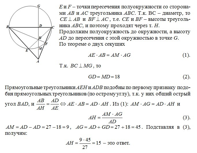 На стороне BC остроугольного треугольника ABC ( AB≠AC ) как на диаметре построена полуокружность, пересекающая высоту AD в точке M, AD=27, MD=18, H — точка пересечения высот треугольника ABC. Найдите АН.