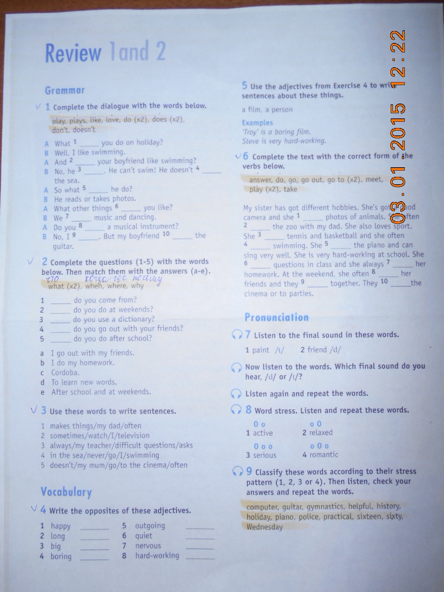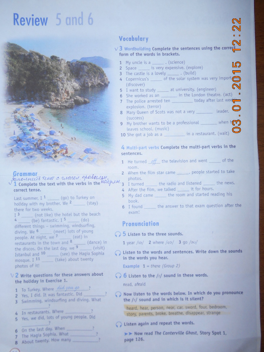 2) you go to the beach? 3) did you do? 4) did you eat? 5) you meet many people? 6) did you visit Instanbul? 7) did you see? 8) photos did you take