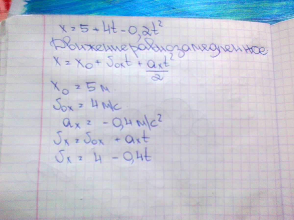 Уравнение скорости имеет вид: x=5+4t-0.2t^2