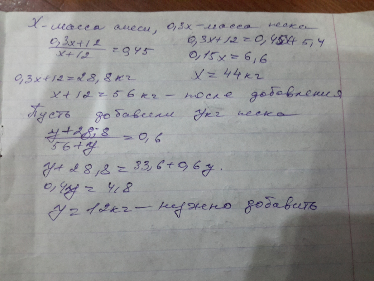 Строительная смесь содержит 30% песка. После добавления в нее 12 кг песка его содержание стало равным 45%. Сколько килограммов песка нужно еще добавить, чтобы его содержание в смеси стало 60%?