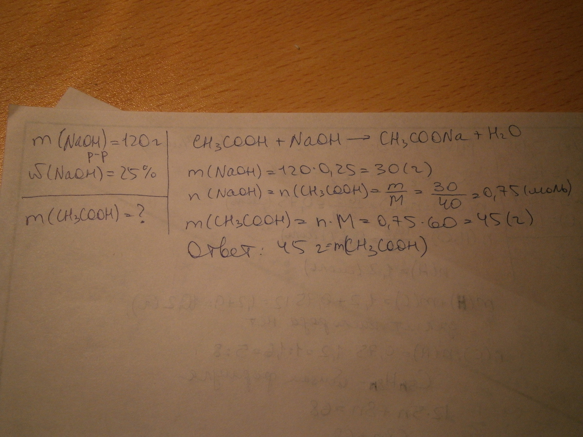 Помогите пожалуйста с задачей, нужно подробно, с дано и решением. Вычислите массу уксусной кислоты, затраченную на взаимодействие со 120 г. 25%-ного раствора гидроксида натрия.