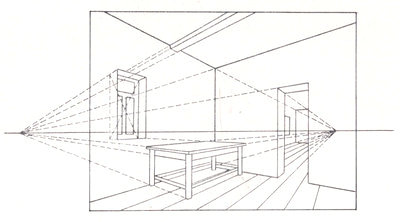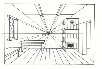 Стоя среди комнаты и смотря прямо на одну из ее стен, мы увидим ее в таком виде (рис. 1). Все уходящие от нас параллельные горизонтальные линии боковых стен, пола, потолка сойдутся в одной центральной точке схода на горизонте. Если мы повернемся лицом к углу комнаты, то будем видеть только две стены, причем параллельные горизонтальные линии каждой стены будут иметь свою точку схода: линии правой стены - налево от зрителя, левой стены - направо от зрителя (рис.2).