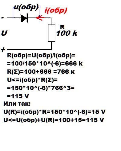 найти максимальное напряжение питания схемы с полупроводниковым диодом и резистором нагрузки 100ком, если сила обратного тока составляет 150 мкА, а допустимое обратное напряжение диода не должно превышать 100В