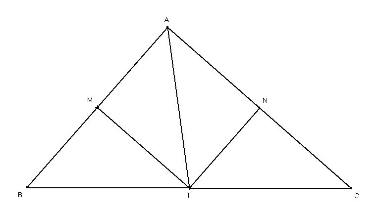 Пусть серединные перпендикуляры MT и NT к сторонам AB и AC соответственно пересекаются в точке T, принадлежащей стороне BC. Проведём отрезок AT и рассмотрим треугольник ABT. В этом треугольнике TM является одновременно медианой и высотой, поскольку TM - серединный перпендикуляр к стороне AB треугольника. Так как TM одновременно является медианой и высотой, треугольник ABT равнобедренный с основанием AB, тогда углы ABT и BAT равны. Аналогично, рассмотрим треугольник ACT, в нём TN является одновременно медианой и высотой, поскольку TN - серединный перпендикуляр к стороне AC треугольника. Значит, треугольник ACT равнобедренный с основанием AC и углы ACT и CAT равны. Тогда угол A=BAC равен BAT+TAC=ABT+ACT=B+C, что и требовалось доказать.