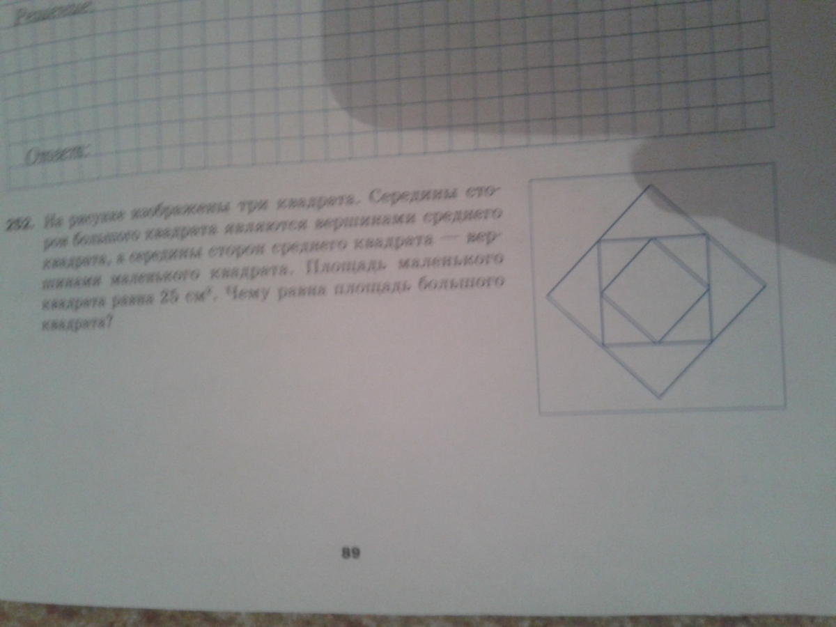 на рисунке изображены три квадрата.Середины сторон большого квадрата являются вершинами среднего квадрата,а середины сторон среднего квадрата-вершинами маленького квадрата.Площадь маленького квадрата равна 25 см2.Чему равна площадь большого квадрата?