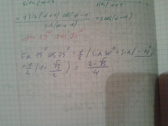 sin15⁰*cos75⁰ = 1/2[sin(15⁰ + 75⁰) + sin(15⁰ - 75⁰)] = 1/2[sin90⁰ + sin(-60⁰)] = 1/2[(1 - √3/2)]
